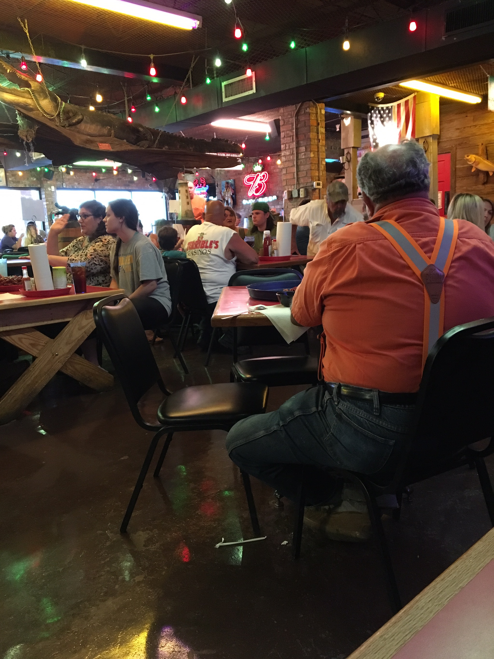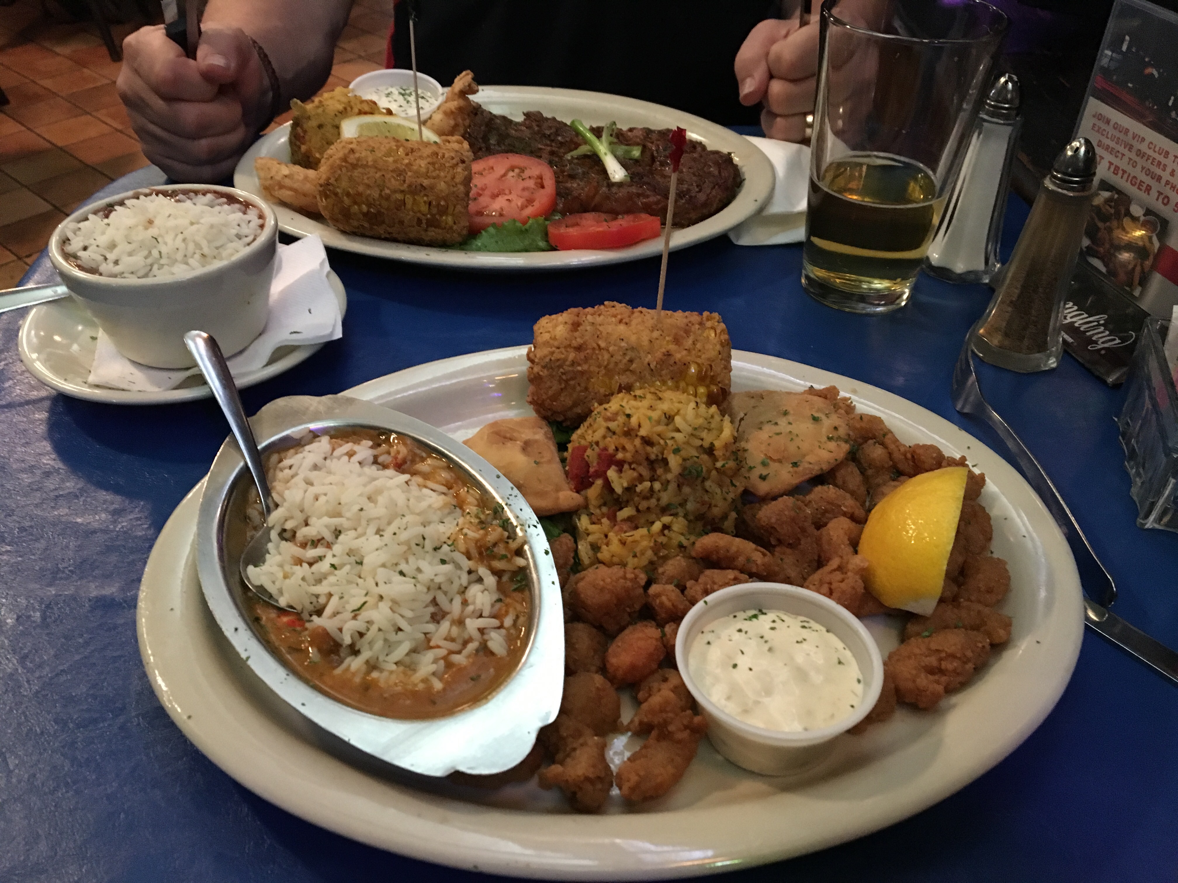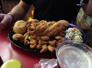 Once we’d arrived at the hotel and cleaned up we took a taxi into downtown Shreveport, which boasted several huge casinos (which we avoided) and some very agreeable bars and restaurants. We started with a local beer or two and then moved onto the food. Mark had steak and I had some assorted seafood in batter accompanied by jambalaya, which was excellent. It was quite a contrast to our meal in Marlin the previous night.